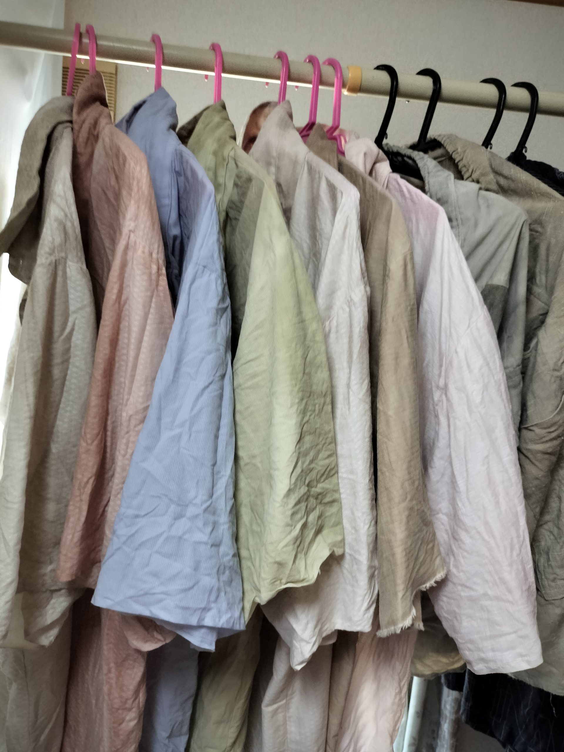 チェックのシャツは夏の暑い時期だったと思います。ボタンは後からつけました。洗ってからしばらく放置しておくとアイロンかけないといけないのがなーなんて、思っていたとき、サンキで試しに買ったポリ80%のTCブロードだとしわができないことに気づき、カラーバリエーションも豊富なのでどんどん作っていきました。