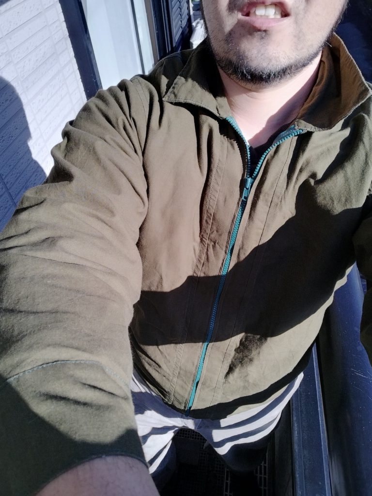 ワイシャツがそろった後は、ブルゾンに挑戦。ワイシャツ作ったときと同じように、本来の布の縦と横を逆に作っていたことや、ファスナーつけるときの布の引っぱり具合が適当だったため、出来上がったものはファスナー部分の布が伸びでビロビロに。母親に相談して、ファスナー部分をつけなおしました。だんだんポケット作るのにも慣れてきて、着るようになって2年目の今年は胸ポケットも付け足しました。
